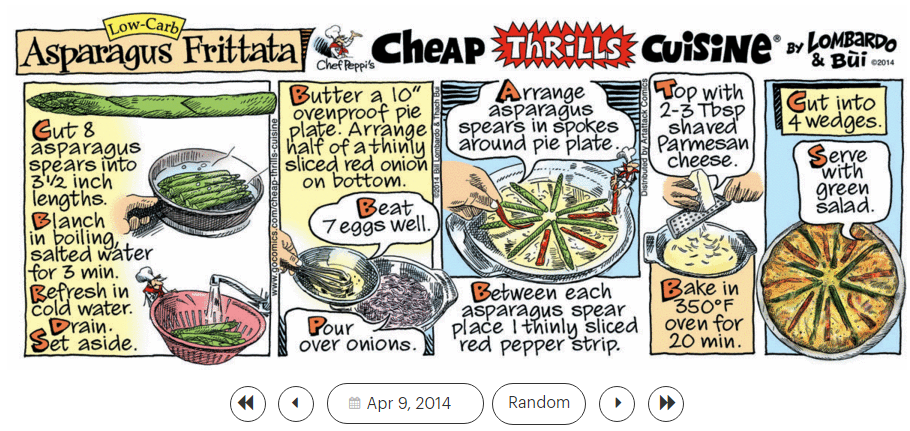 ‘Layla,’ ‘Laughing,’ ‘Let’s Twist Again,’ and ‘Life in the Bloodstream,’ and the ‘Cheap Thrills Cuisine’ recipe ‘Asparagus Frittata (low-carb).’