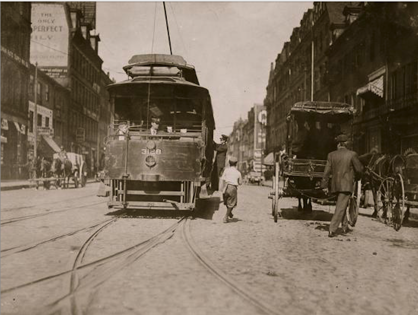 Well, there is a street car and a horse drawn car — but that newsboy doesn’t look up to flipping either one of them…