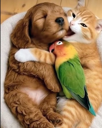 I like how the cat and the bird are both chewing on the oblivious pup.