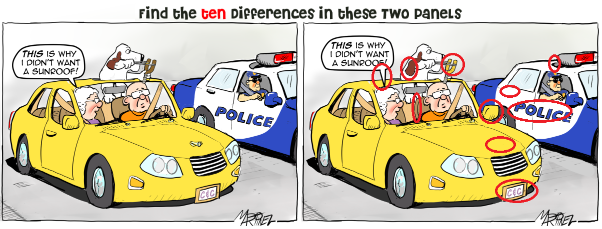 I found the differences, but my circling thereof, without a computer, apparently leaves a bit to be desired.