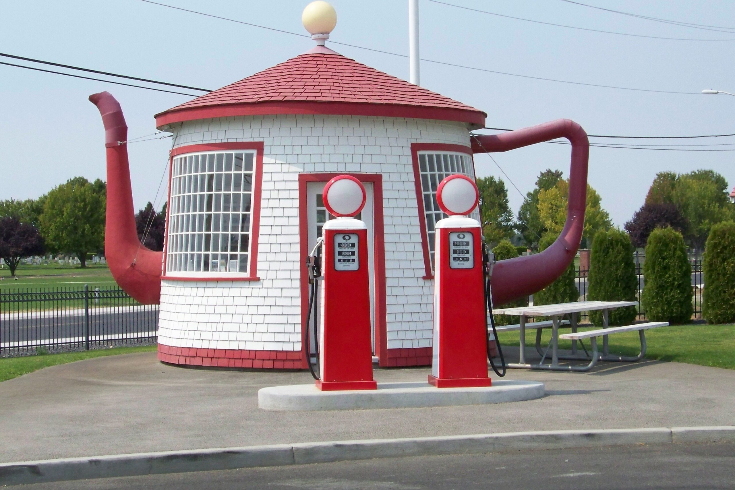 I figured it wasn’t terribly old…. That picnic bench looks like something from Costco, the gas pumps are zeroed out, and you can see what might be glimpses of modern cars through the fence.
