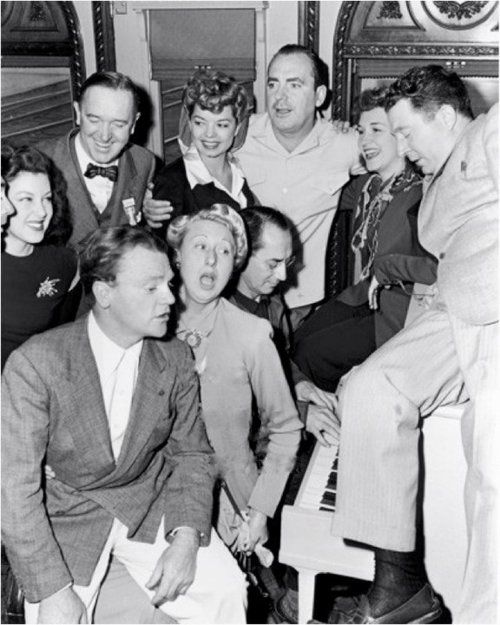 L-R (top): Actors Cary Grant, Faye McKenzie, Stan Laurel, Frances Langford, Pat O’Brien, Rise Stevens, Frank McHugh, (bottom) James Cagney, Charlotte Greenwood, and Groucho Marx, playing piano.