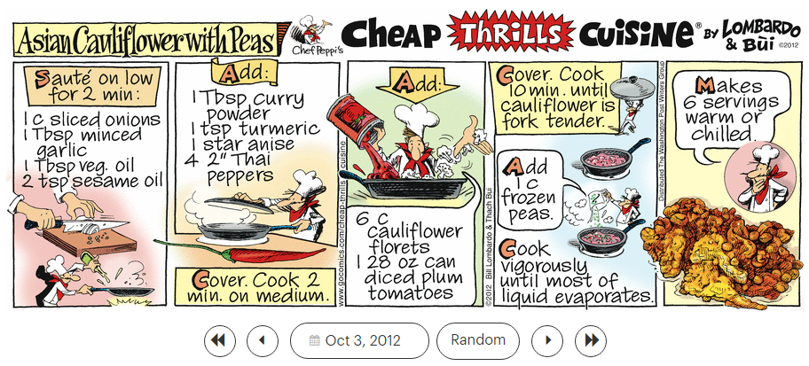 ‘House at Pooh Corner,’ ‘I Can’t Do The Sum,’ ‘I Can’t Help Myself,’ and ‘I Don’t Like Mondays,’ and the ‘Cheap Thrills Cuisine’ recipe ‘Asian Cauliflower with Peas.’