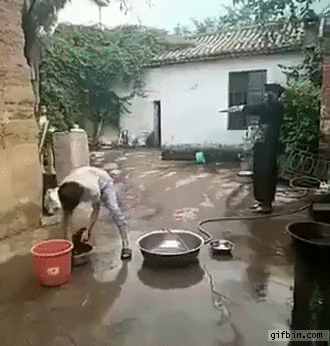 It’s staged for social media views. There’s no water in the bucket, and someone happens to be filming at just the right time. There’s a lot of these about, a lot of them quite well done.