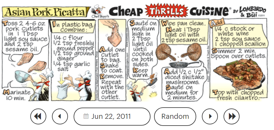 ‘Incense and Peppermints,’ ‘Indian Reservation (Cherokee Nation),’ ‘Indiana Wants Me,’ and ‘Is This The Way to Amarillo,’ and the ‘Cheap Thrills Cuisine’ recipe ‘Asian Pork Picatta’.’
