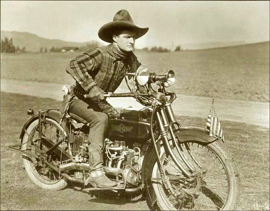 Western film star Tom Mix on a Henderson motorcycle, 1919.