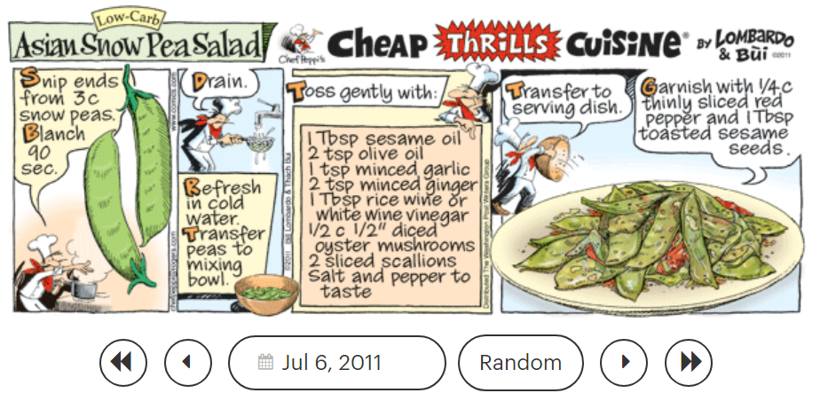 ‘It Ain’t What You Do, It’s the Way That You Do It,’ ‘Itchycoo Park,’ ‘It’s the End of the World as we Know It,’ and ‘Jail House Rock,’ and the ‘Cheap Thrills Cuisine’ recipe ‘Asian Snow Pea Salad (low carb)’.