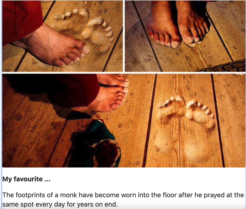 No wearing away motion would leave sharp ridges that undercut the toes… Those dark shadows would have to be sticking up higher than the toe tips, not engraved deeper into the floor.