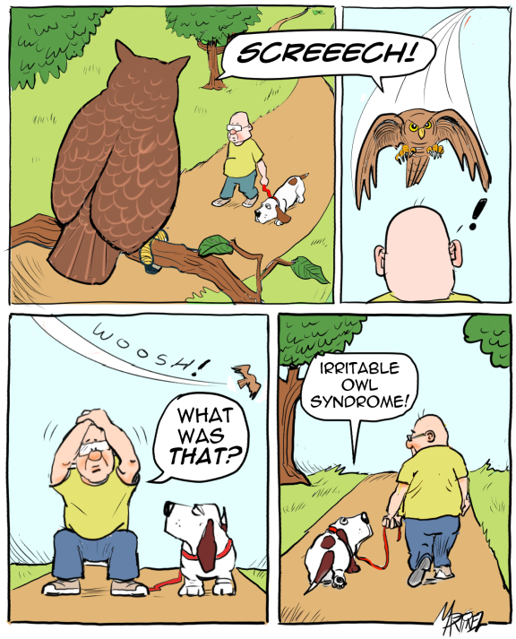 “Irritable owl syndrome” That’s hysterical. Whooo do you think you are, posting such fowl puns?