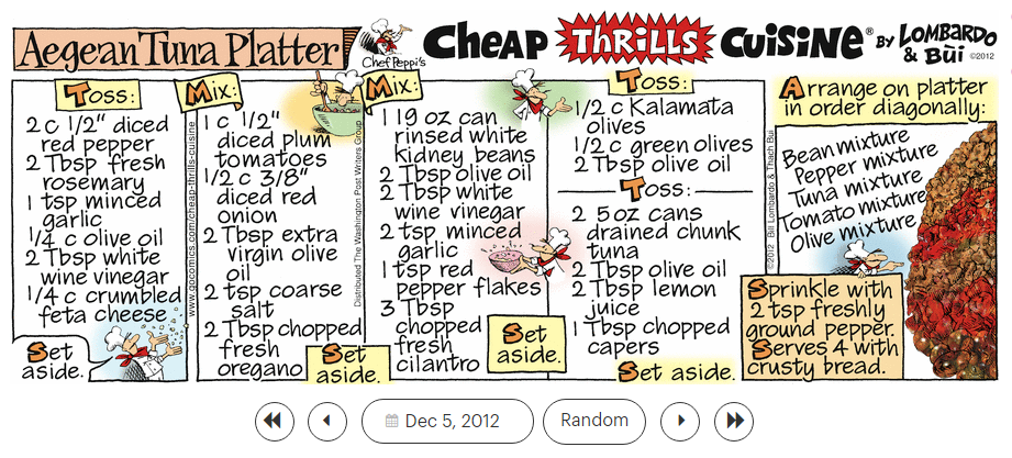 Can of white tuna, currently 5 oz., curry powder, and some green vegetable or /blend. Sprinkle bread crumbs on top. It is the easiest thing in the world and impossible to screw up.