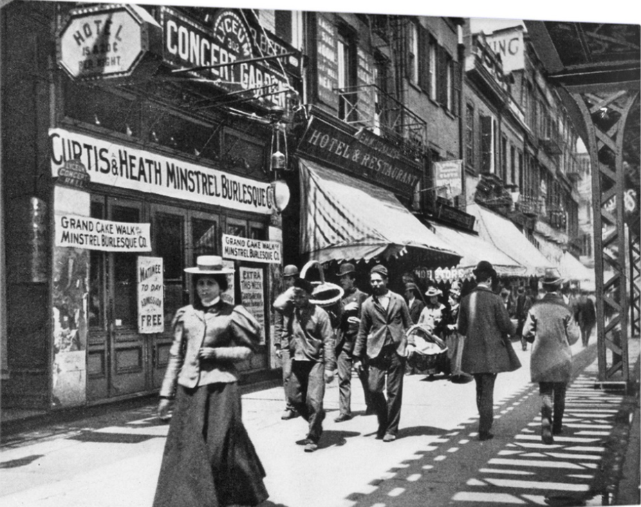 By 1905, the Bowery was already a place where you could find all manner of disreputable attractions… burlesque houses, like the one pictured, sleazy hotels, pawn shops and prostitutes. It was also a center for gay bars and gay nightlife, and for a street gang called the Bowery B-boys.