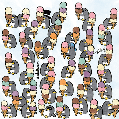 Well, I was presuming that it was only the ice cream combinations and their order that counted… Otherwise it would totally confuse the issue that there’s only one pair of sunglasses and one of each hat, and the penguins themselves don’t match.